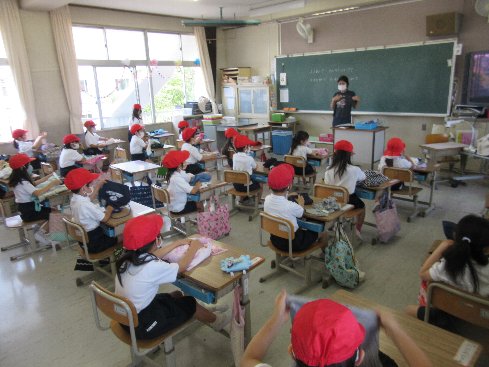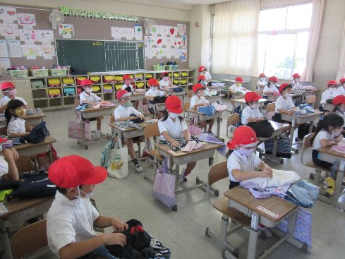 1時間目は初めての体育でした。着替えをして、脱いだ服をどうやって片付けるか。先生に教えてもらいながら進めました。