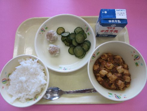 ご飯、牛乳、焼売、麻婆豆腐、胡瓜の香り付け