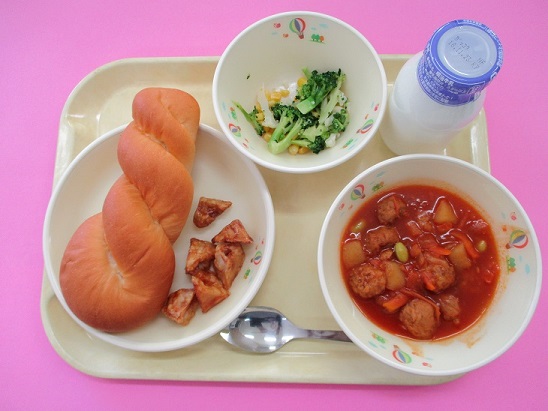 ツイストロールパン、牛乳、肉団子のトマト煮、れんこんの甘から揚げ、花野菜サラダ