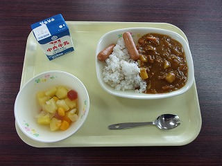 カレーライス(麦ごはん)、牛乳、ウィンナー、