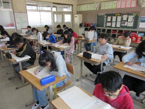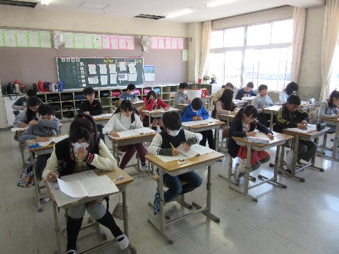 1時間目から3時間目は、全国学力学習状況調査でした。例年この時期に6年生を対象に行われる学力検査です。どの子も真剣に取り組んでいました。