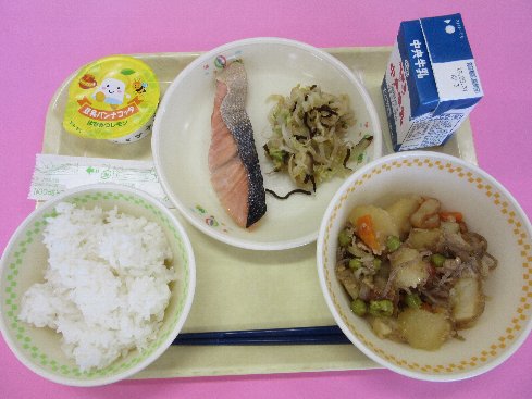 ご飯、牛乳、鮭の塩焼き、肉じゃが、白菜の昆布和え、豆乳パンナコッタ