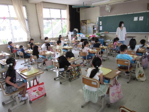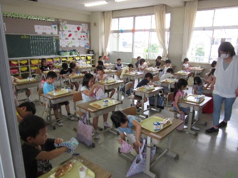 今日は、1年生にとって初めての給食でした。例年だと、カレーライスですが、今年は簡易給食のため寂しいメニューになってしまいました。それでも、先生の指示に従って、しっかりと食べていました。