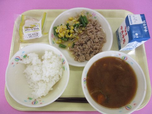 ご飯、牛乳、豚肉の生姜炒め、もやしとコーンの和え物、ジャガイモの味噌汁、レモンカスタードタルト