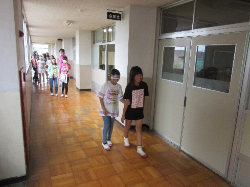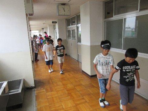 福祉実践教室では、ガイドヘルプ体験をしました。目の不自由な方がどのように困っているか、また、どのようにお手伝いをしたら良いかを体験をしました。