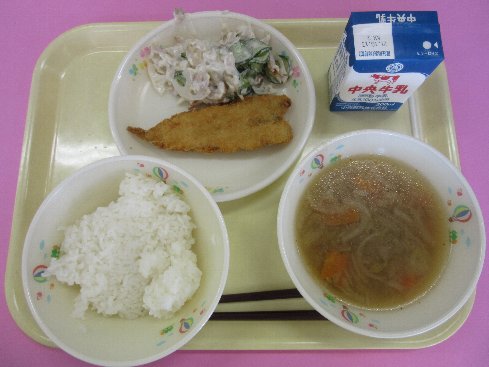 ご飯、牛乳、ニギスフライ、蓮根サラダ、オニオンスープ
