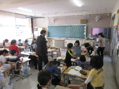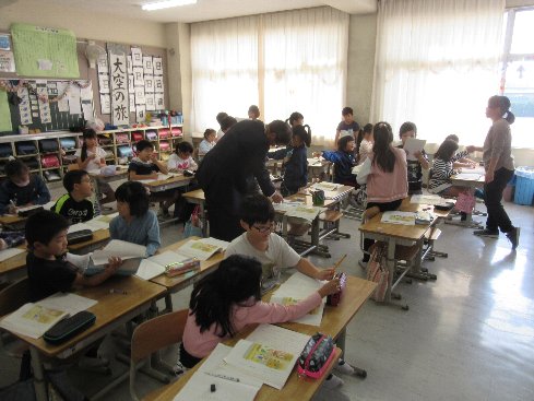 1時間目は国語の授業でした。3年とうげで転んでしまったおじいさんは、どうしたらいいか考えました。