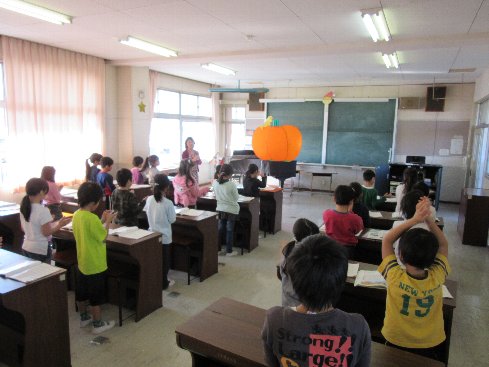 2時間目は音楽の授業でした。「かぼちゃ」という曲を、いろいろな楽器で表現する練習をしました。