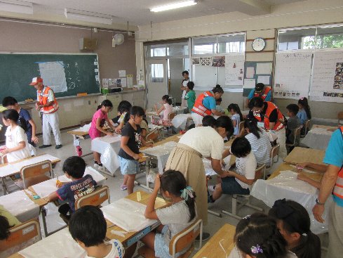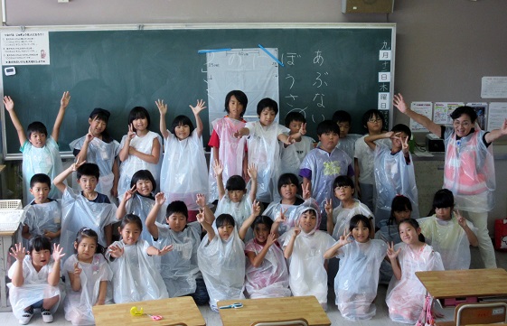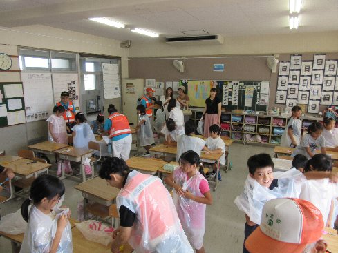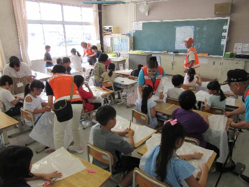 3時間目は防災教室でした。ゴミ袋でカッパ作りに挑戦しました。