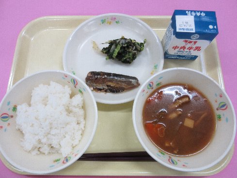 ご飯、牛乳、鰯の生姜煮、磯香和え、大根の味噌汁