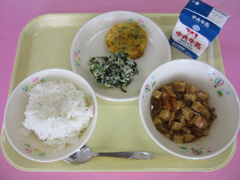 ご飯、牛乳、麻婆豆腐、芙蓉蟹、中華サラダ
