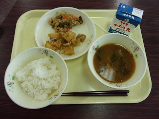 ご飯、牛乳、白身魚のあげてり、大豆の五目煮、なめこの味噌汁