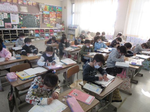 6月5日(火)4時間目は国語の授業でした。ひらがなワークを進めて、できた子から順番に先生に見てもらいました。