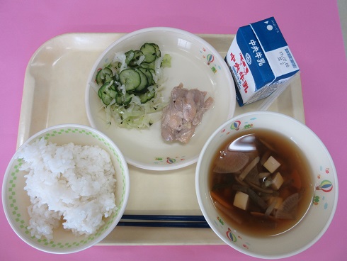 ご飯、牛乳、鶏肉のレモン焼き、青菜和え、けんちん汁