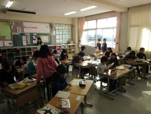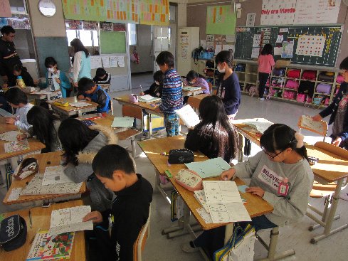 1時間目は国語の授業でした。「クラブ活動のリーフレット」を作ろうという単元で、完成したリーフレットを見せ合いました。