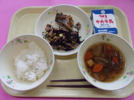 ご飯、牛乳、鰆の香味焼き、ひじきの炒め煮、けんちん汁、ヨーグルト