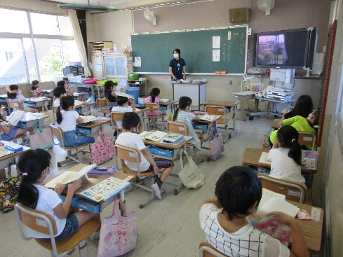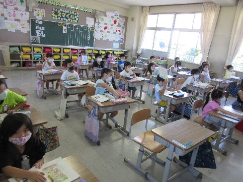1時間目は国語の授業でした。「ぶんをつくろう」ということで、教科書をもとに〇〇が〇〇したという文をつくって発表しました。