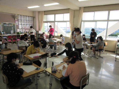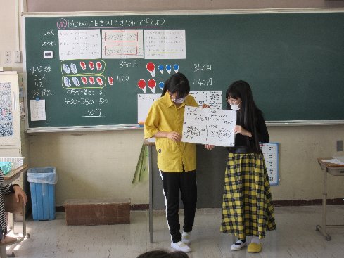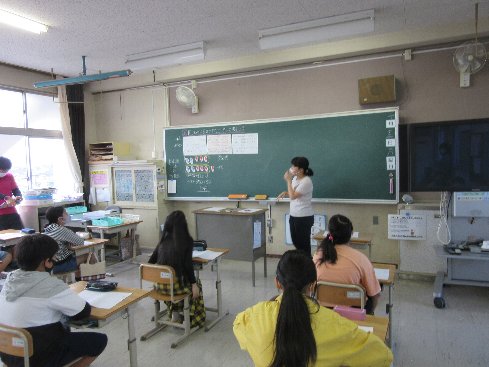 1時間目は算数の授業でした。同じものに目をつけて、問題を解く方法について考えました。研究授業でしたので、たくさんの先生方が見に来ていました。