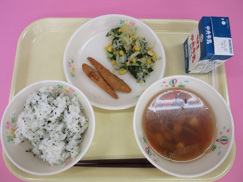 菜めし(ご飯)、牛乳、メヒカリフライ、和風サラダ、具だくさん汁