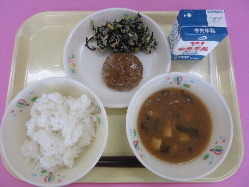 ご飯、牛乳、蓮根ハンバーグ、ひじきの和え物、薩摩芋の味噌汁