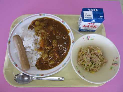 カレーライス(麦ご飯)、牛乳、フランクフルト、ツナサラダ