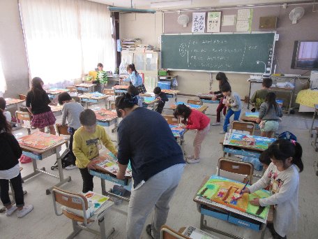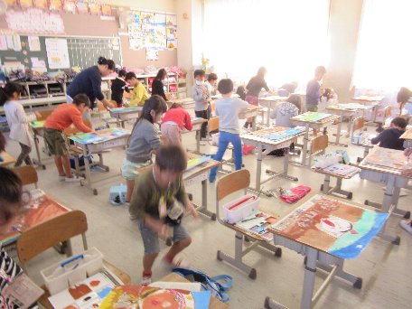 3時間目は図画工作の授業でした。作品展の「お話の絵」の色塗りをしました。どんどん完成に近づいています。