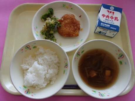 ご飯、牛乳、たれチキンカツ、花野菜のおかか和え、けんちん汁