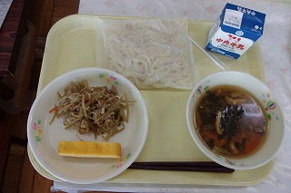 五目うどん、牛乳、あつやきたまご、きんぴらごぼう