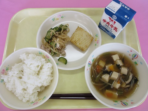 ご飯、牛乳、イカのカレー焼き、切り干し大根の和え物、ちゃんこ汁