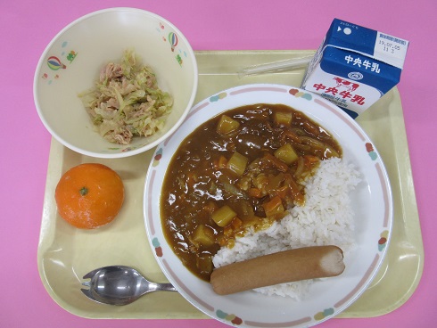 カレーライス(麦ご飯)、牛乳、フランクフルト、キャベツとツナの和え物、冷凍みかん