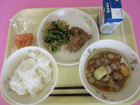 ご飯、牛乳、鶏肉の照り焼き、和風ポトフ、昆布和え、柿