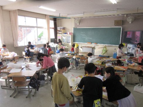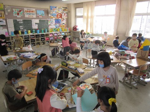 1時間目は生活科の授業でした。おもちゃパーティの準備をしました。おもちゃもほとんどできあがり、どうやって1年生と遊ぶかを考えました。
