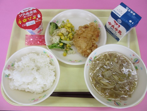 ご飯、牛乳、鶏天、花野菜サラダ、さわにわん、ヨーグルト