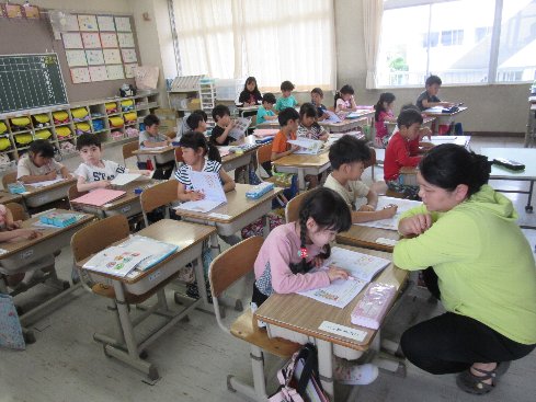4時間目、天候悪化のため、教室の戻って計算ドリルに取り組みました。