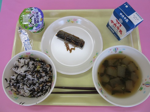 ひじきご飯(ご飯)、牛乳、秋刀魚の生姜煮、冬瓜汁、ブルーベリーヨーグルト