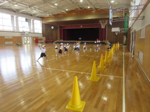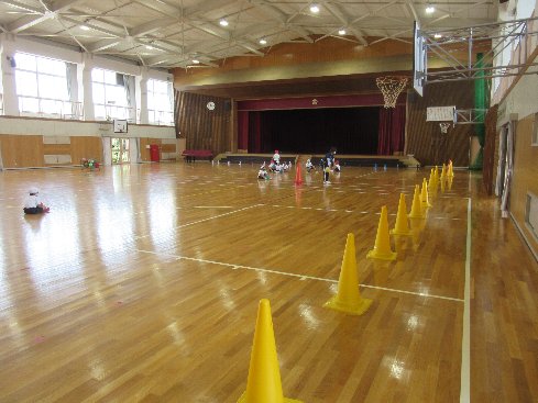 ボールを使っていかに早くコーンを倒すか競争しました。