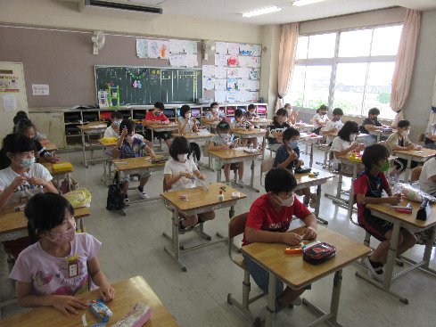 2時間目は図画工作の授業でした。始めに接着剤の使い方を確認してからコロコロガーレのコース作りをしました。