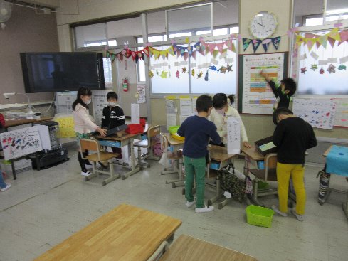 4月26日(木)3時間目は図工の授業でした。前に書いた「おひさまの絵」に、名前を書いた札つけました。
