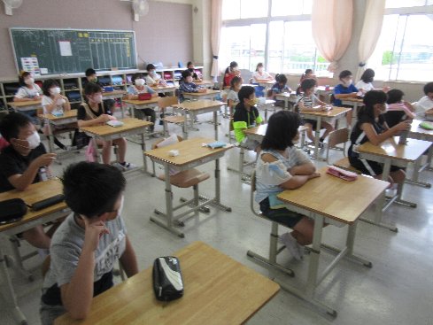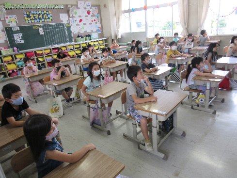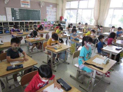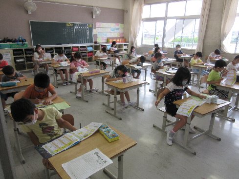 業前の時間を有効に使って、漢字や計算に取り組んでいます。1年生は、まだまだできることが限られているので、担任の先生による読み聞かせをしました。子どもたちはとても嬉しそうにお話の世界を楽しんでいました。5・6年生は、どうしたらなかま活動を行うことができるか考えました。