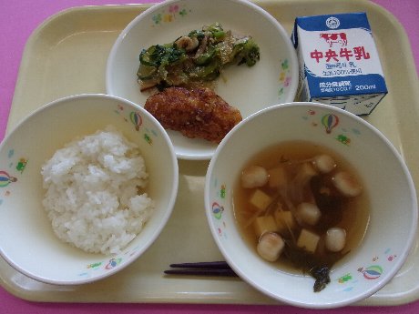 ご飯、牛乳、鱈の竜田揚げ、糸寒天の和え物、麩の澄まし汁