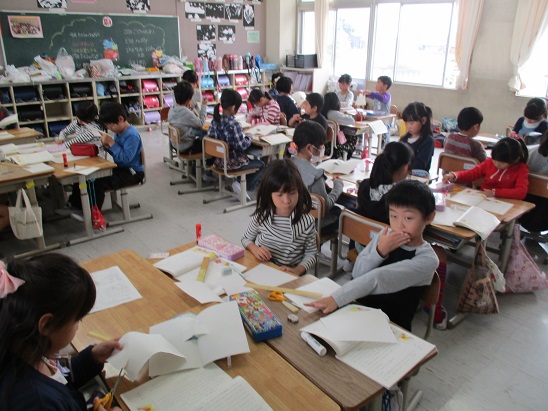 4時間目は国語の授業でした。しかけカードのつくりかたを読んで、実際にできるかどうか確かめました。