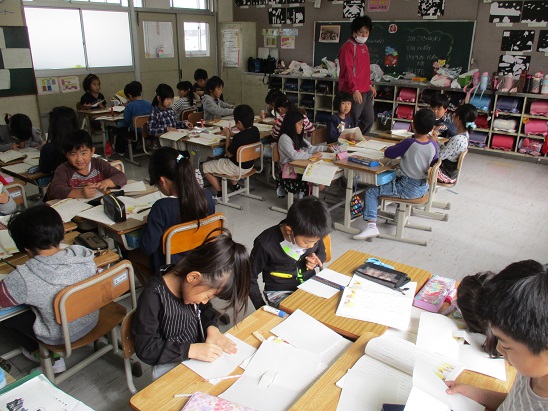 5月30日(水)3時間目は算数の授業でした。章末問題に取り組みました。早くできた子が「小さい先生」になって、理解がまだの子のお手伝いをしていました。