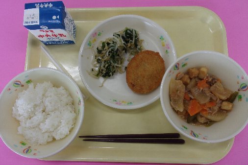 ご飯、牛乳、コロッケ、豚肉と大根の煮物、ほうれん草の胡麻和え