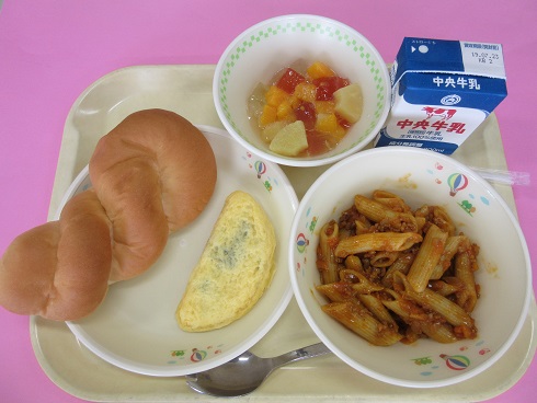 愛知のツイストパン、牛乳、ペンネマカロニのミートソース、ほうれん草のオムレツ、フルーツ和え
