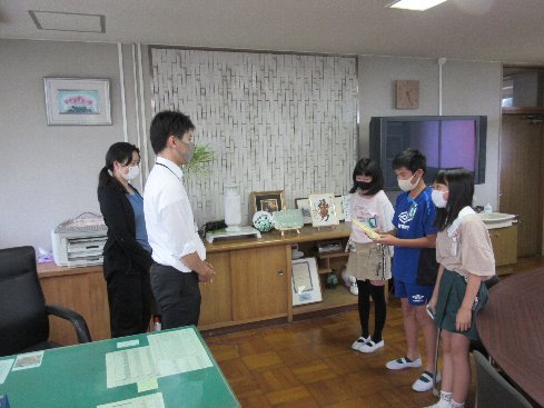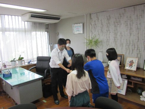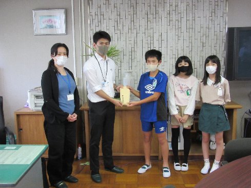 本日、あま市産業振興課の方に、緑のはね募金の回収に来ていただきました。児童会が募金に取り組んで、秋竹小学校の子どもたちが参加した募金です。校長室で、6年生の児童会役員が募金を手渡しました。