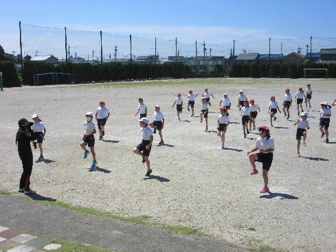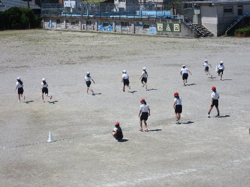 2時間目は体育の授業でした。準備運動のあと、その場駆け足や腿上げ、シャトル走など、基礎的なトレーニングを行いました。