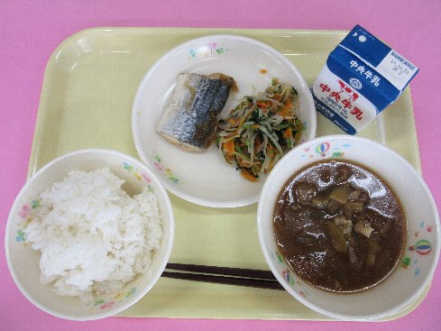 ご飯、牛乳、鰆の香味焼き、小松菜のお浸し、茄子の味噌汁