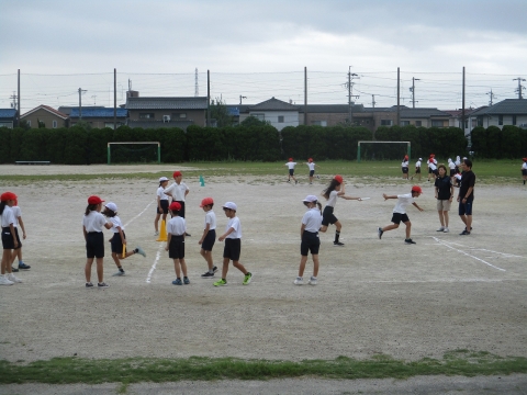 バトンパスの練習をしていました。バトンを渡す子も、受け取る子もスピードを落とさないようなバトンパスを目指して取り組んでいました。