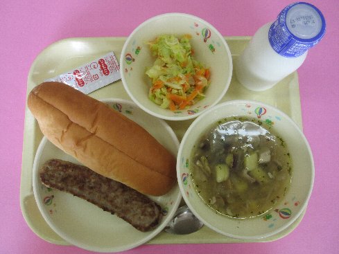 サンドロールパン、ケチャップ、牛乳、棒ハンバーグ、キャベツソテー、薩摩芋とベーコンのスープ