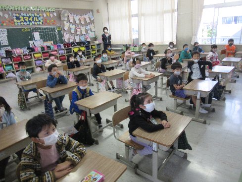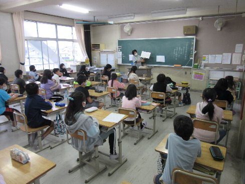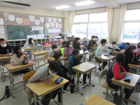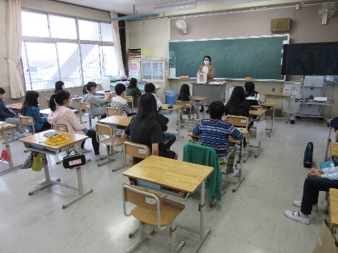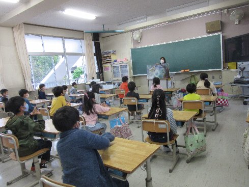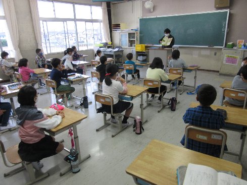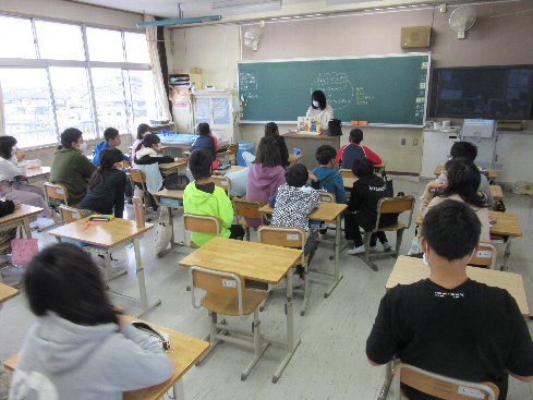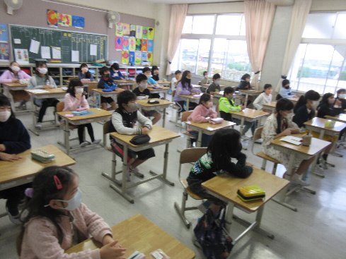 今朝の業前はメルポケでした。メルポケ(=メルヘンポケット)は、秋竹小学校の保護者の有志の方による読み聞かせのサークルです。このサークルのお母さんたちが、月に一度、業前の時間に読み聞かせをしてくださっています。今年度は、新型コロナウイルス感染症予防のため、開催を見送ってきましたが、隊形を通常の授業と同じにして、ようやく再開の運びとなりました。子どもたちはメルポケが大好きです。身を乗り出して、聞いていました。